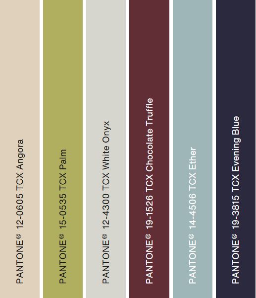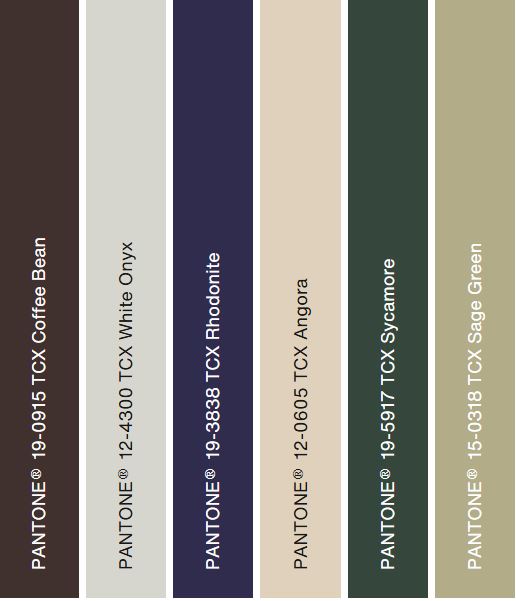 Colours are Coffee Bean 19-0915 TCX, White Onyx 12-4300 TCX, Rhodonite 19-3838 TCX, Angora 12-0605 TCX, Sycamore 19-5917 TCX, Sage Green 15-0318 TCX
