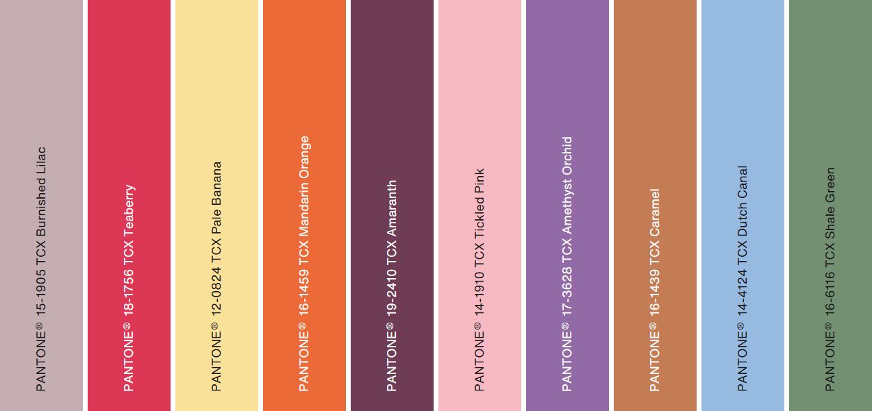 Colours highlighted are Burnished Lilac 15-1905 TCX, Teaberry 18-1756 TCX, Pale Banana 12-0824 TCX, Mandarin Orange 16-1459 TCX, Amaranth 19-2410 TCX, Tickled Pink 14-1910 TCX, Amethyst Orchid 17-3628 TCX, Caramel 16-1439 TCX, Dutch Canal 14-4124 TCX, Shale Green 16-6116 TCX.