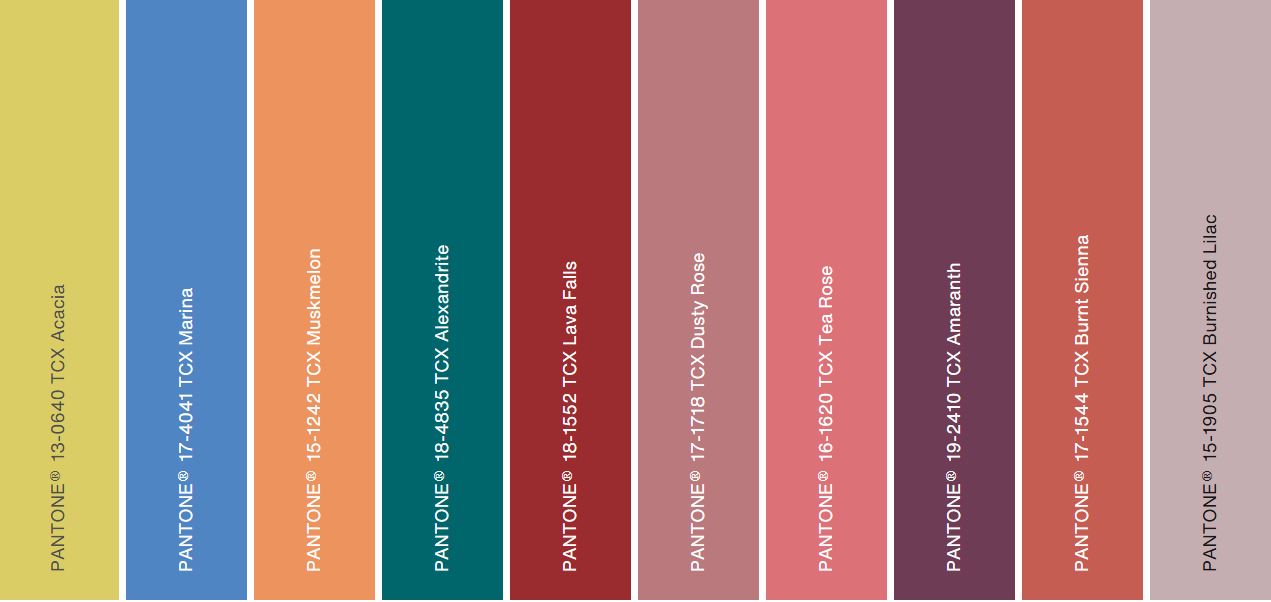 The colours include the vibrant Acacia 13-0640 TCX, Marina 17-4041 TCX, Muskmelon 15-1242 TCX, Alexandrite 18-4835 TCX and Lava Falls 18-1552 TCX, as well as the softer pink tones of Dusky Rose 17-1718 TCX, Tea Rose 16-1620 TCX, Amaranth 19-2410 TCX, Burnt Sienna 17-1544 TCX, Burnished Lilac 15-1905 TCX